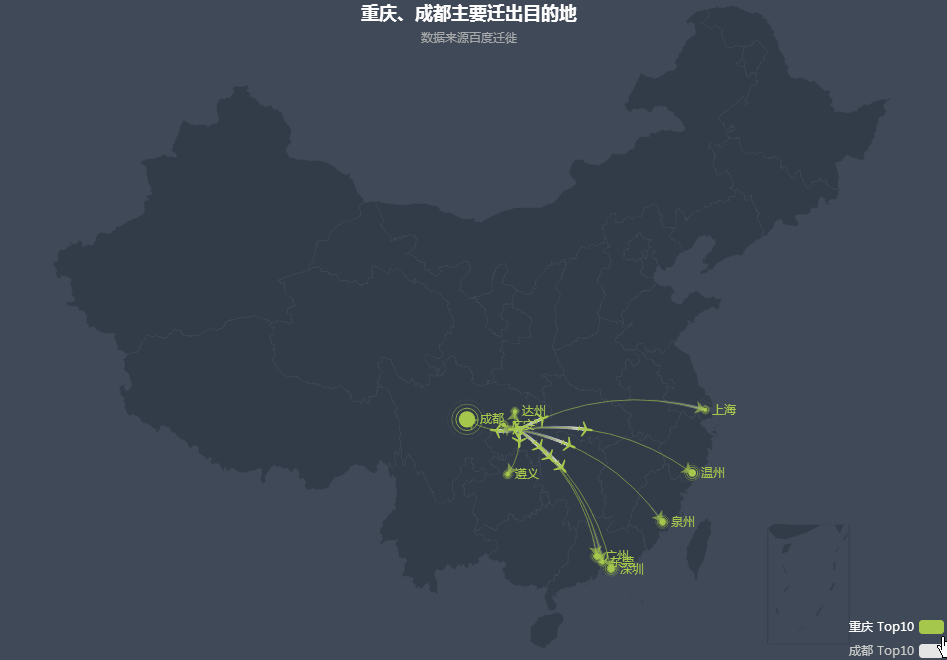 从两市的人口外迁情况来看,重庆、成都人口外迁的最主要目的地都是对方:重庆外迁人口的目的地主要为成都、周边三四线城市、珠三角城市以及东部沿海的泉州、温州和上海三市,目的地为成都的外迁人口占总外迁数量的24.62%,其次为温州、深圳和泉州,迁徙至周边三四线城市的人口占比相对较少。