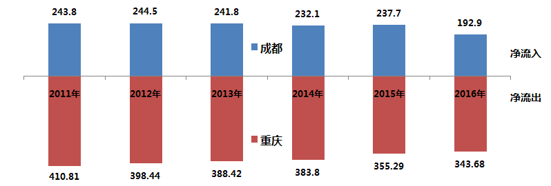 图:重庆、成都2011年至2016年人口净流入净流出情况(单位:万人)