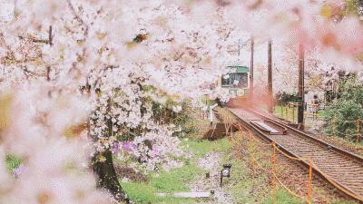每当桃花、杏花、樱花盛开之时,列车驶过,