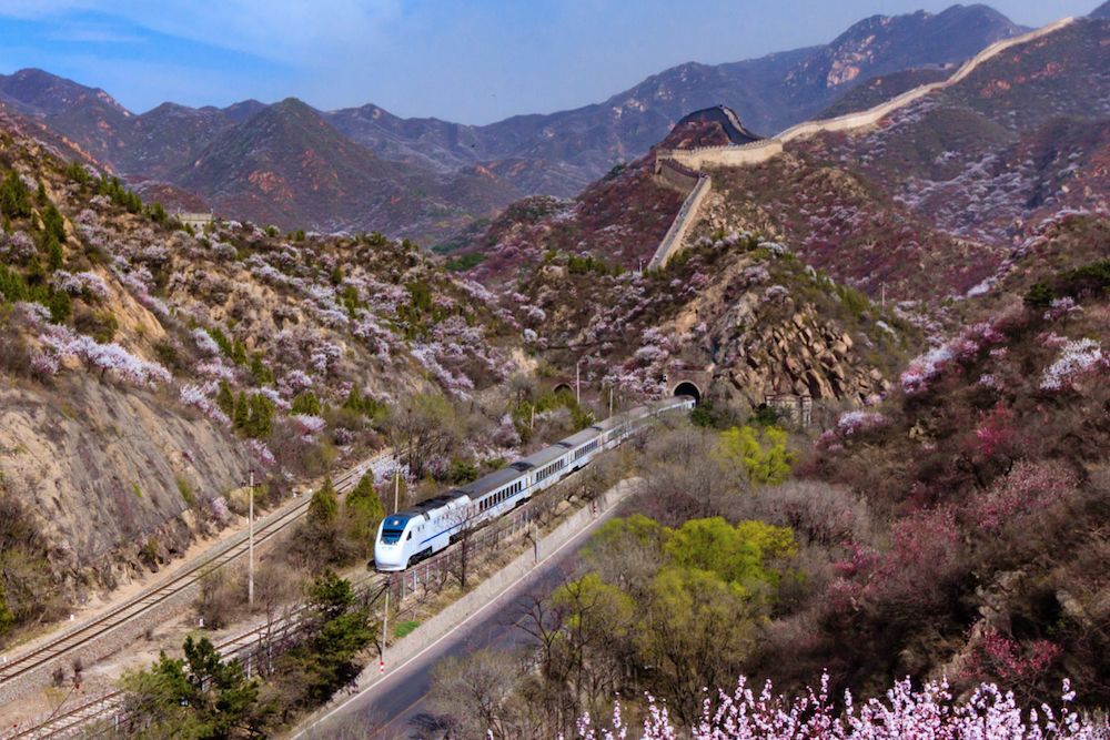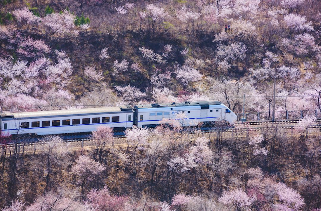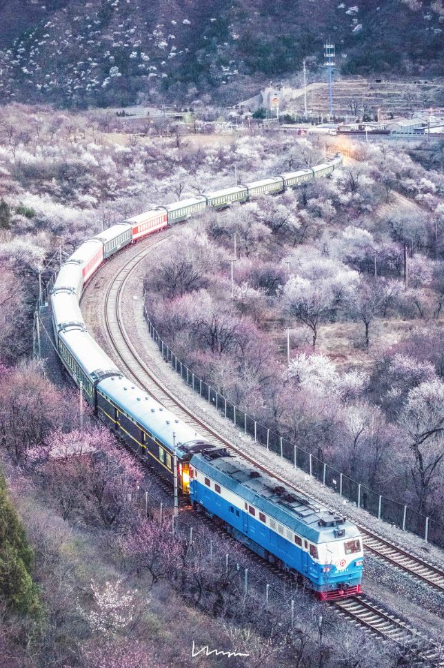 近几年爆红的北京居庸关长城脚下“开往春天的列车”。