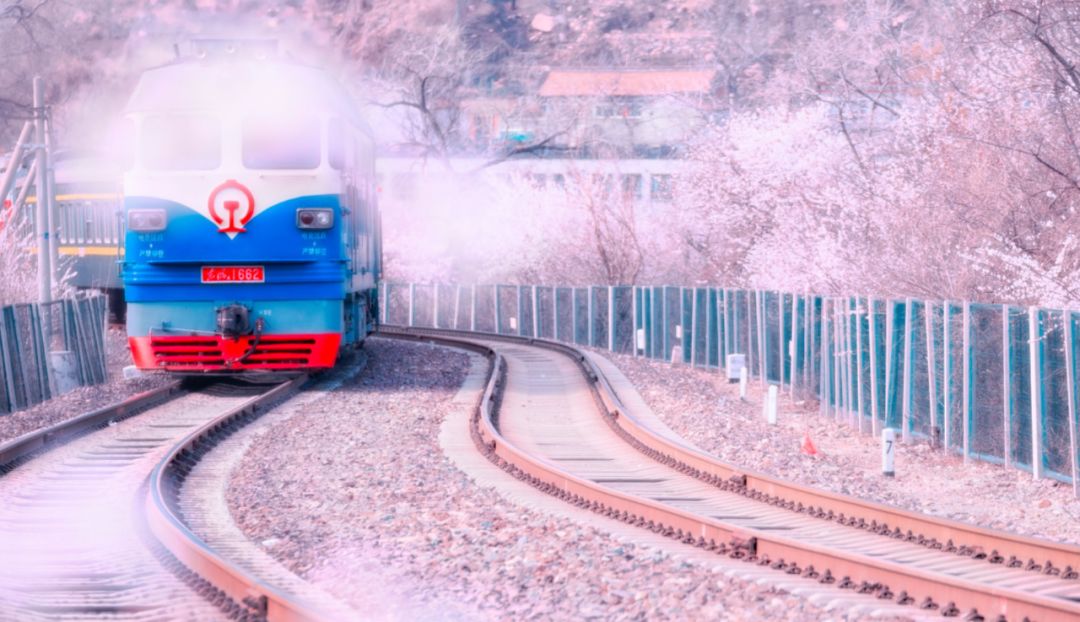 轨道两旁有粉色的山桃花、樱花和白杏,
