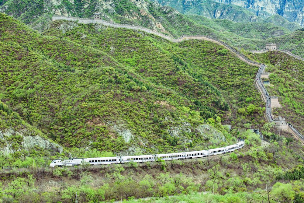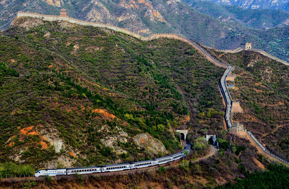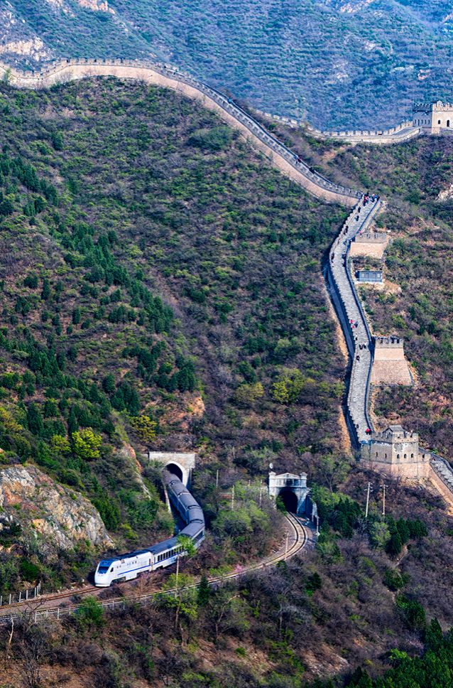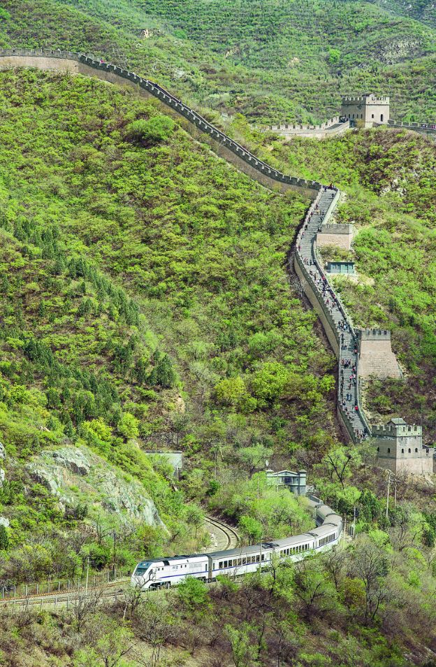 疾驰而去的列车,缓缓漫步在长城的游客,
