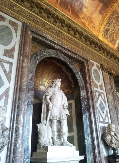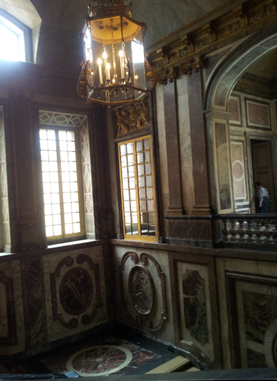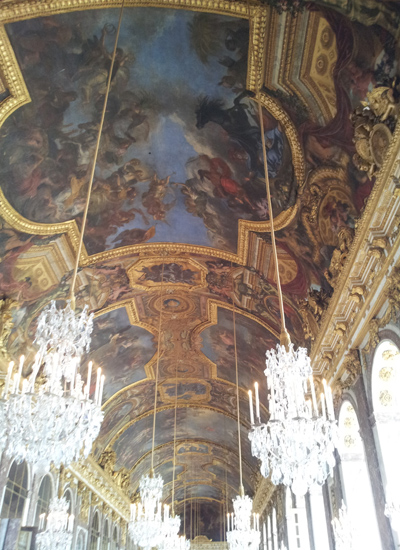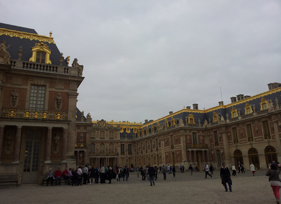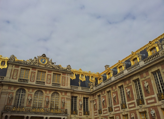 在凡尔赛宫的一天,从自正门入口向外延伸,在大理石庭院三面围合的小广场斑驳的方形砖面上排起的绵长蜿蜒的蛇形参观队伍开始。放眼望去,古典主义风格的宫殿与城堡金碧辉煌,气势磅礴。正宫东西走向,两端与南宫和北宫相衔接,形成严密协调的几何型布局。宫顶建筑采用平顶形式,立面为标准的古典主义三段式处理,左右对称,轮廓整齐,显得端正雄浑,是理性美的代表。红色大理石外壁上端,伫立着人物雕像。门窗,阳台,屋顶的花边状金色装饰和纯金色大门一道,将宫殿上方湛蓝的天空映衬得光芒万丈。