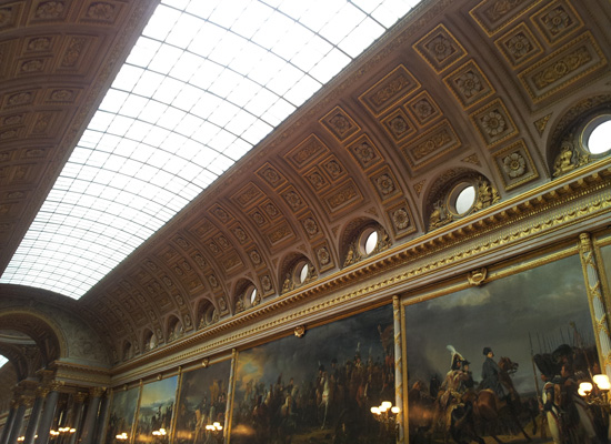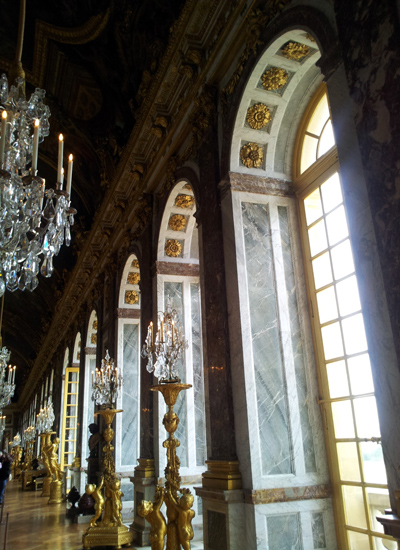 镜厅也称镜廊,西临花园,是宫内最著名的大厅。采用巴洛克装饰风格,全长72米,宽10米,高13米。长廊一面是17扇朝花园开的巨大拱形窗门,另一面镶嵌着与拱形窗相对称的17面镜子,这些镜子由400多块镜片组成。拱形天花板上有24具巨大的波希米亚水晶吊灯和歌颂太阳王功德的气势磅礴的巨副油画。厅内地板为细木雕花,墙壁以淡紫色和白色大理石贴面装饰。绿色大理石柱的柱头、柱脚和护壁均为黄铜镀金,装饰图案是展开双翼的太阳,表达对路易十四的崇敬。漫步在镜廊内,阳光遍洒,天空碧蓝、静谧的花园美景尽收眼底。波旁王朝时期经常在这里举行盛大的化妆舞会,著名的“凡尔赛公约”也是在这个大厅里签署。