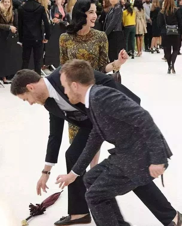 年过40的蒂塔·万提斯在Burberry秀场红毯上弄掉了雨伞,立马有两名小伙抢着帮她拾起。