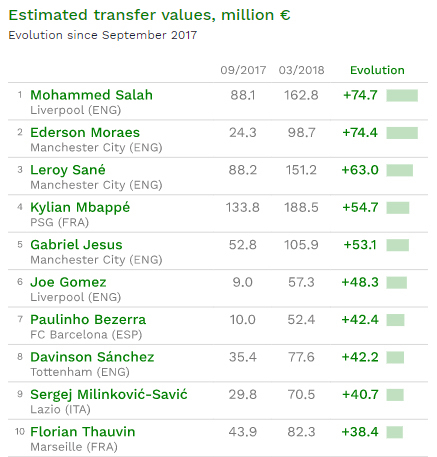 近日,CIES通过计算过去半年中五大联赛里的各项数据,得出了一份球员身价涨幅榜单。2017年9月至今,没有转会或变更合同的球员中,25岁的利物浦前锋穆罕默德·萨拉赫以7470万欧元的增长位列榜首。