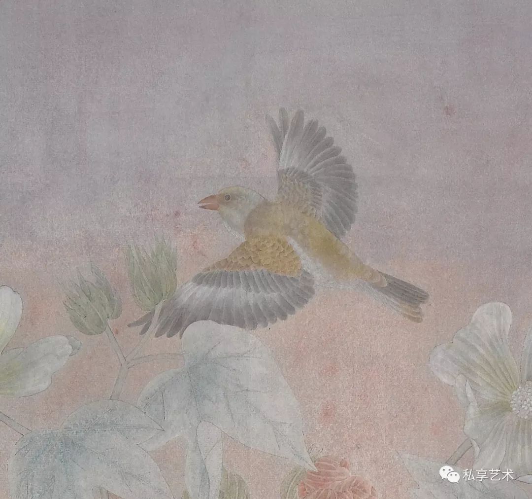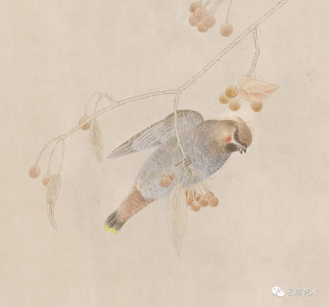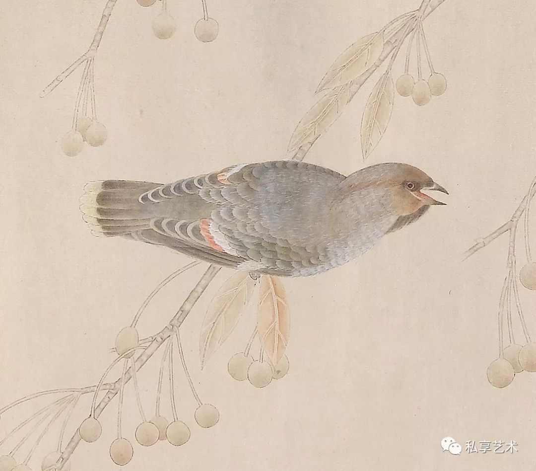 我被一只羽翼美丽的鸟所吸引,于是精心地刻画,不停修正,当一只鸟呈现了,园中的老石榴也果熟了,摘下一枝,在书案前慢慢摆弄使其与鸟适配;空隙间又填入了紫薇,因为湖边的几枝还开着花,紫白相杂,碎碎密密的,数日后画成立了。——江宏伟