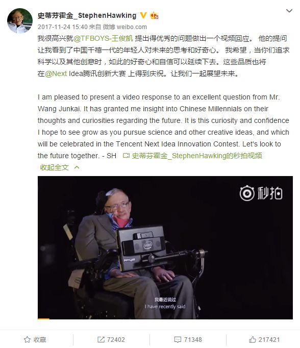 不少中国网友激动地表示:“妈妈,快来看!我拿到霍金的联系方式了!我在和他聊天呢!”