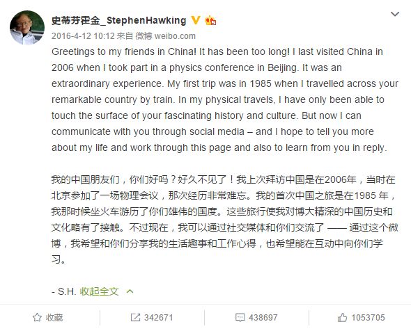 中国网友迎来了这位宇宙无敌大咖级别的微博好友。