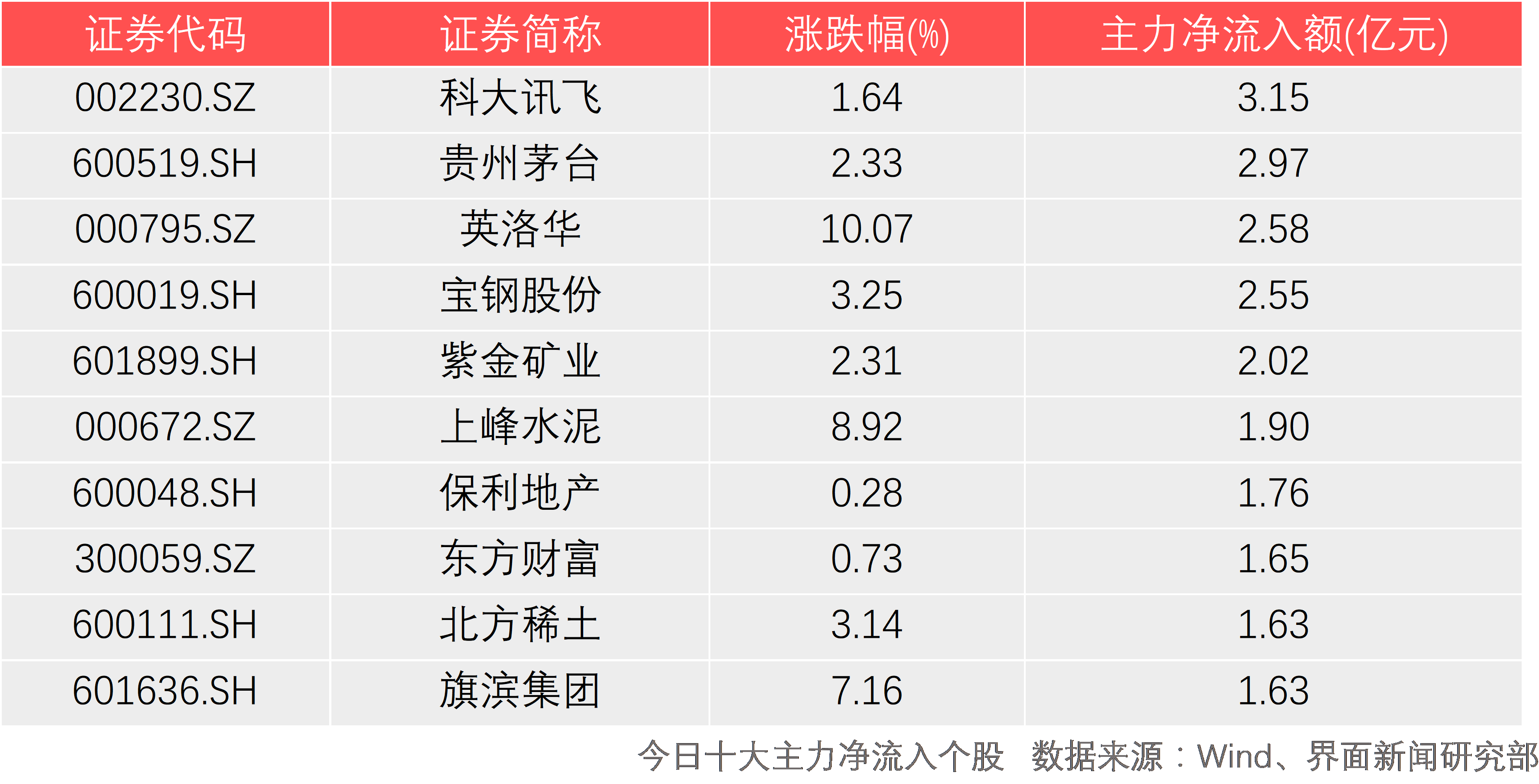 从个股表现上来看,今日主力资金净流入排名前三的是科大讯飞(002230.SZ)、贵州茅台(600519.SH)、英洛华(000795.SZ),分别净流入3.15亿元、2.97亿元、2.58亿元。贵州茅台前一交易日遭主力抛售3.21亿元,今日重获主力资金青睐;黄金概念紫金矿业(601899.SH)获主力净流入2.02亿元。稀土永磁股今日走强:英洛华获主力抢筹涨停,北方稀土(600111.SH)获主力资金净流入1.63亿元。