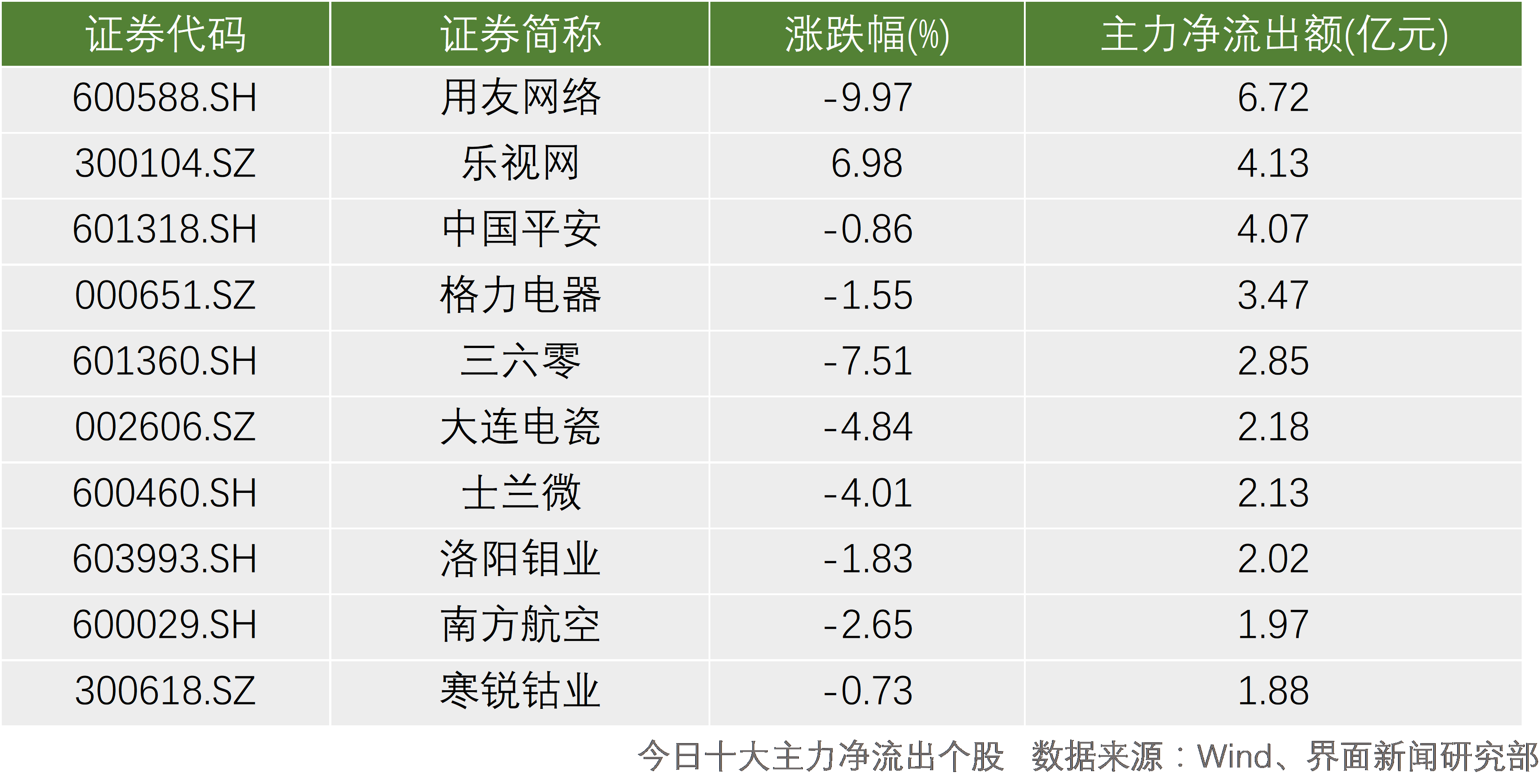 用友网络(600588.SH)、乐视网(300104.SZ)、中国平安(601318.SH)成为主力资金今日重点抛售对象,分别净流出6.72亿元、4.13亿元、4.07亿元。工业互联网概念股用友网络午盘跳水,临近尾盘跌停。乐视网前一交易日开盘时分即获主力抢筹涨停,而今日早盘主力资金却大量流出。乐视网因股价异常波动已于下午临时停牌。