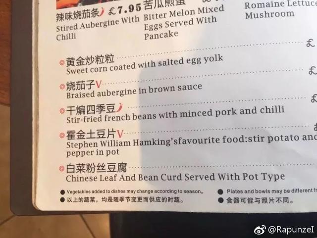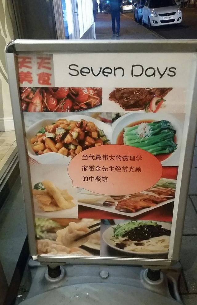 在霍金生活的英国剑桥,有一家名叫「天天美食」(Seven Days)的中餐馆,每当嘴馋了,霍金便会去那家店点一盘炒土豆片,尝了尝味道便会吐出来。