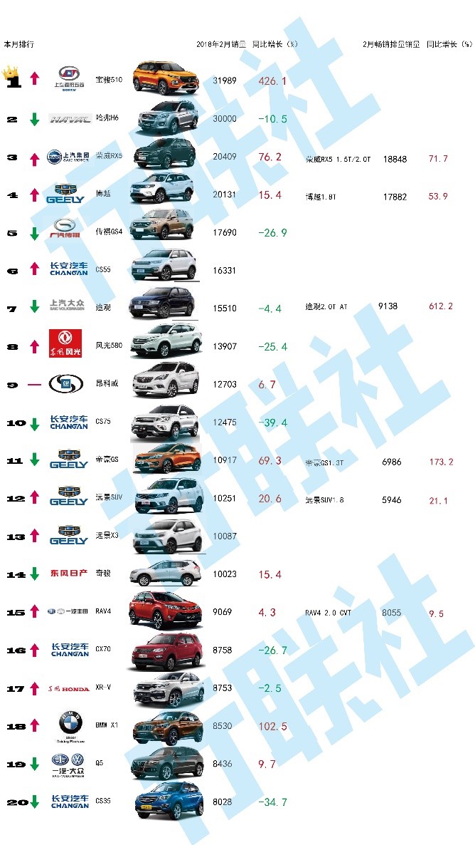 中国最畅销的SUV在2018年2月易主,宝骏510以近2000辆的优势挤掉哈弗H6,“意外”成为SUV市场新的月销量王,此前哈弗H6将这一“荣誉”保持了5年之久。这也进一步反映出长城SUV的优势不再明显,彭博行业研究2018年展望中曾分析, 长城汽车在中国SUV 市场的份额将继续被蚕食,因为竞争对手们均在推出更具吸引力和高性价比的汽车。