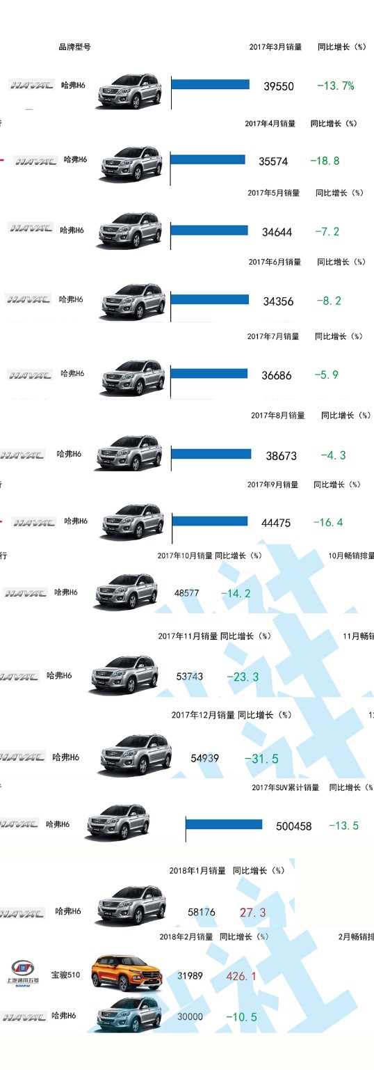 在2017年,虽然长城汽车哈弗H6仍牢牢占据SUV月销量榜首,但其增长率在2017年明显放缓,遭遇了长达10个月的同比负增长,直到2018年1月再次同比正增长。