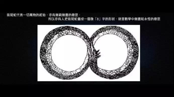 它被称作衔尾蛇,是世界上最古老的神话符号之一。大致形象为一条蛇正在吞食自己的尾巴,结果形成一个扭纹形,即阿拉伯数字“8”的形状,有“自我吞噬”的意思。同时衔尾蛇也代表了“自我参照”或“无限循环”,其中一个最好的例子就是传说中的不死鸟,它在自我焚灭的过程中自我繁衍或重生,正是无限循环概念的一种表现。