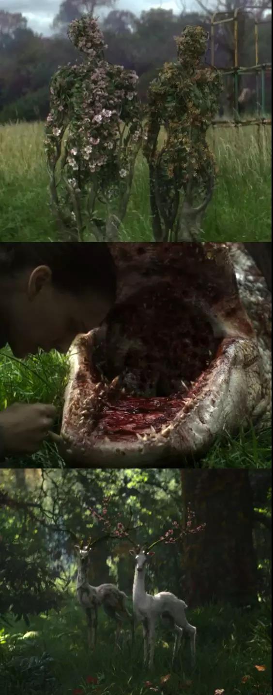 影片中着墨最多的另一个概念,则是基因折射。生物间的基因相互影响、相互吸收,从而使得影片中出现生长成人形的植物,有鲨鱼牙齿的鳄鱼,形态和动作都同步的白鹿以及能说话的狗熊。