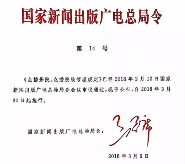 近日,广电总局发布了第14号文件《点播影院、点播院线管理规定》(以下简称《管理规定》),并宣布自2018年3月30日起正式实施。这份文件对点播影院行业做了全方位的定义和规范。