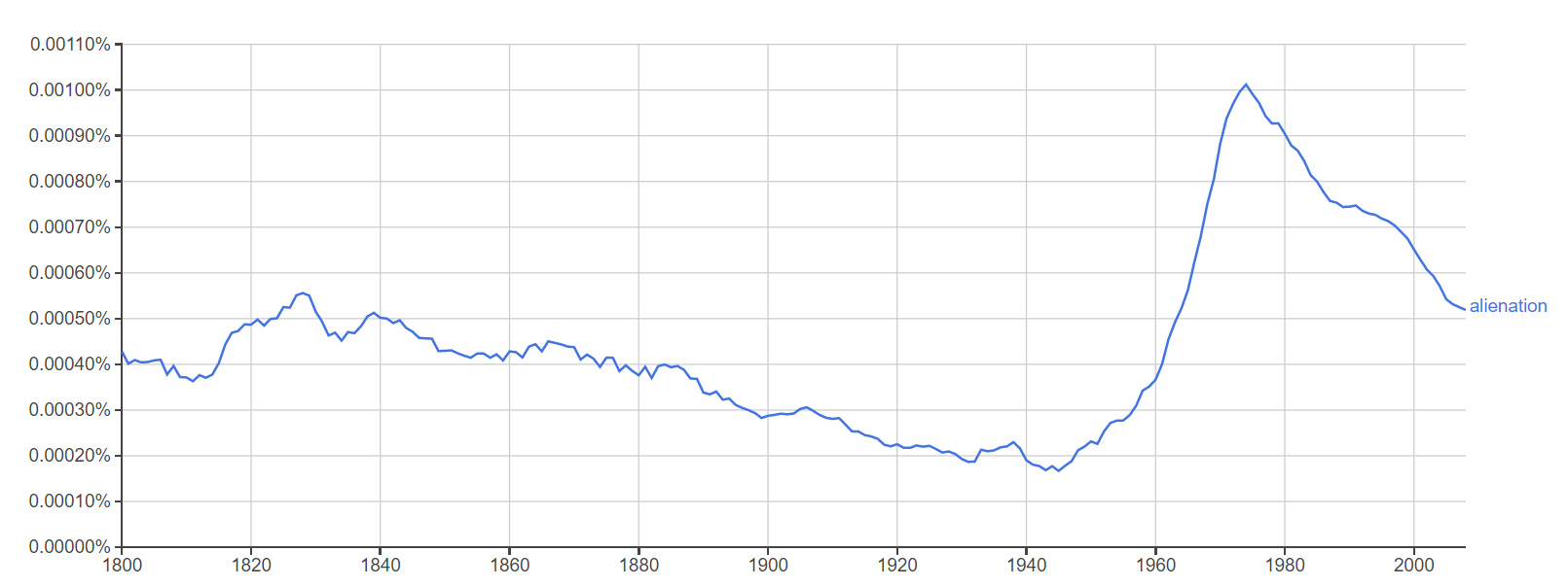 人们对“异化”的恐惧有着漫长而曲折的历史。从亚当夏娃离开伊甸园的圣经故事,到奥德修斯历经艰险回到伊萨卡的史诗传奇,类似的故事充斥着整个西方文化,人们害怕被逐出家园,也渴望着回归。直到现代社会,尤其是上世纪五六十年代,“异化”才迎来了真正的鼎盛时期,成为解释一切不满的法宝。当时,美国社会的物质生活越来越充裕,早期压抑人性的标志——贫困、不平等、社会固化、宗教迫害——都逐渐衰落,评论家和知识分子需要一个新的出口来解释人们的不满。用谷歌的Ngram Viewer(注:一款书籍词频统计器,建立在Google Books庞大的数据库基础上,囊括了全球1500万本藏书内的字汇,可以观察词汇在不同年代书籍中出现的频率)在英文书籍中检索“异化”,结果显示词频从1958年开始急剧上升,直到1974年到达顶峰,随后又迅速下降。这其中的原因是什么?异化在词汇使用上的减少是否意味着异化现象本身已经被攻克了?或者仅仅是使用这个词的语境发生了变化?