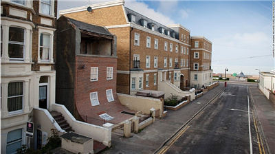 而英国设计师Alex Chinneck则把房子想象成布料,将建筑的底部像床单一样拖拽出来,让看似坚固的混凝土结构瞬间变得细腻脆弱。