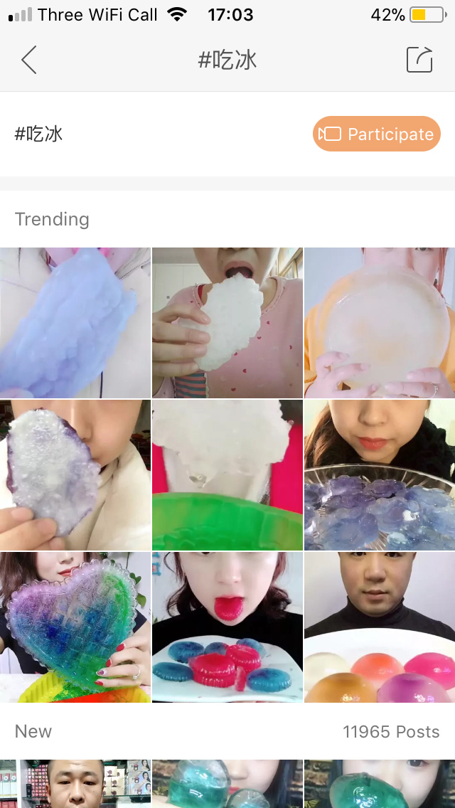 这个APP和其他的中文视频分享APP,比如抖音,没什么太大区别,它支持用户拍摄和剪辑短视频,并且带有滤镜和特效功能。在#吃冰这个标签下,有数千条短视频。