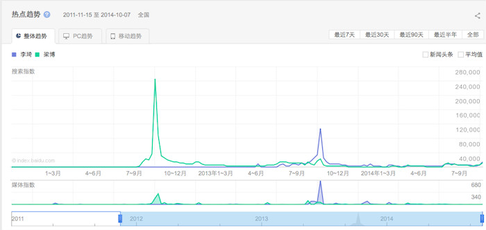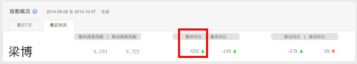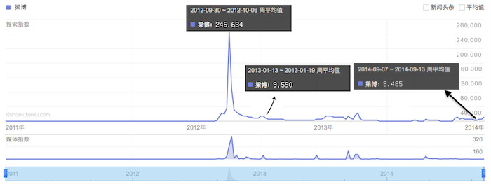 2012年9月,梁博获得第一季《中国好声音》年度冠军,搜索指数周平均值达到246,634次。在接下来的一年里,这个值在5000到15,000的范围里波动,直到第二季好声音开赛,又有小幅提升。
