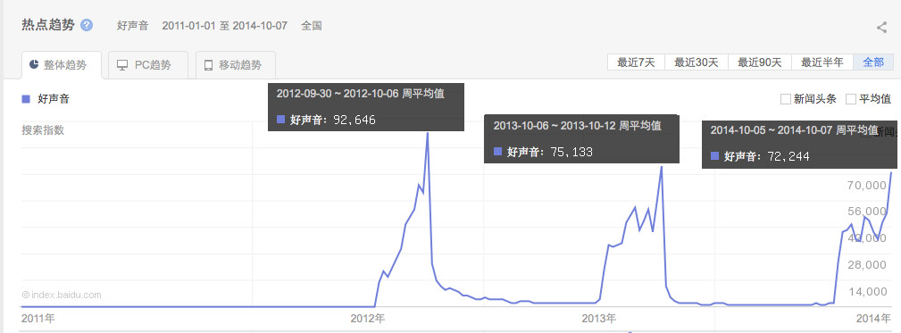 而且不幸的是,中国好声音早已不复当年的意气风发。搜索指数下降不说,还被网友戏称为“中国好黑幕”,这背后的一出出“宫心计”,大概看得网友们也是累了。