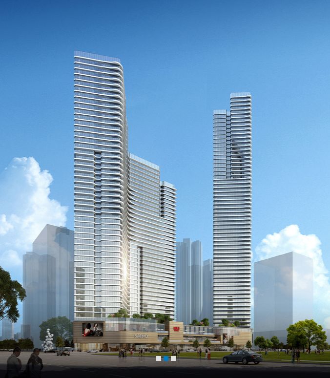 世豪广场二期位于一期南侧,项目占地25.5亩,建筑规模23万平方米,设计单位为SWI 惟尚国际,由一栋200米的点式住宅,一栋160米+130米的板式住宅,以及地下两层+地上三层的shoppingmall组成。高级住宅塔楼呈环抱状面向大源中央公园,塔楼通过转动角度的方式争取到更多的对景公园朝向。商业通过退台的设计提高溢价,而商业层面设计成住宅的公园配套。住宅业主可不出地面,直接通过电梯连接到地下室和地铁实现无缝对接。塔楼立面通过横线线条与开槽的设计,削弱大体量的同时营造出有机的自然生长之势。