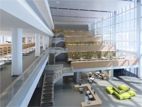 图书馆共5层,藏书量为100万册。部分电子阅览、咖啡等配套设在共享环内,对市民开放使用。