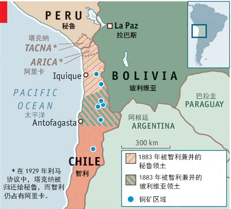 玻利维亚和智利的对峙已经持续了将近一个世纪。1879年至1883年南美太平洋战争由玻利维亚和智利的贸易争端引起,以智利打败玻利维亚和秘鲁联军告终。