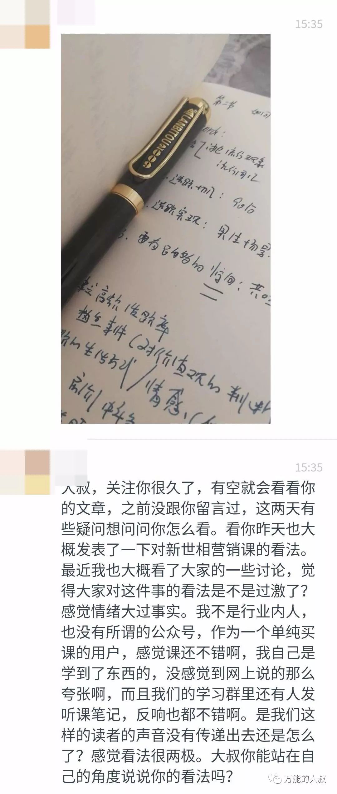 昨天,大叔收到一位粉丝的留言,他大致的意思是:他听完新世相创始人张伟的营销课后,觉得很有启发,还把他在群里看到的笔记发给了我,也表达了一些困惑:为什么有一些人要退款?难道是他自己的辨别能力差?