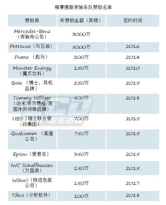 我们来梳理一下梅赛德斯奔驰车队这12个赞助商的来头以及赞助金额——