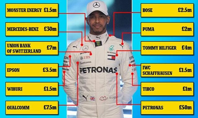 汉密尔顿与几家公司包括Tommy Hilfiger、彪马、Bose和魔爪饮料单独签署了个人代言合同,这会使他的个人收入再增加1000万英镑。