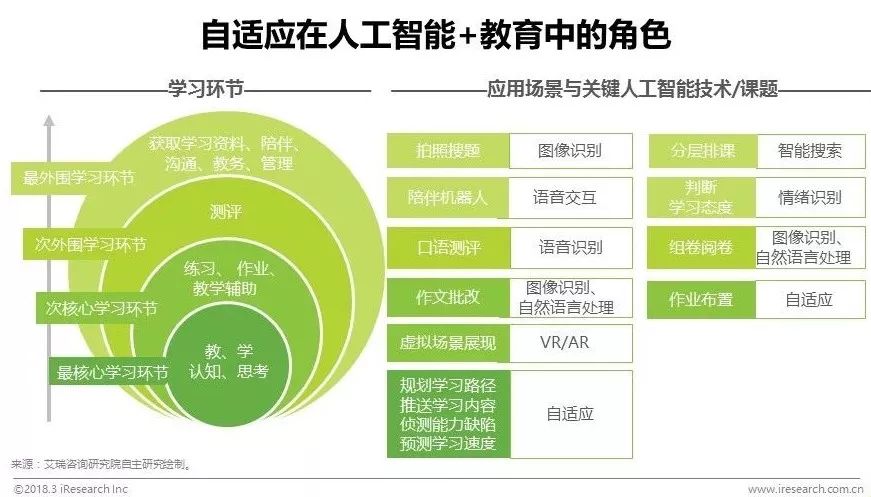 目前,基于人工智能技术的教育产品包括拍照搜题、分层排课、口语测评、组卷阅卷、作文批改、作业布置等工具,这些工具应用了先进的人工智能技术,但应用场景只停留在学习过程的辅助环节上,其价值也停留在减少重复劳动的层面上,并不会直接带来教学质量和效果的提升。而自适应则能够把人工智能技术渗透到教学的核心环节中,打造教学机器人,从根本上改进学习的理念和方式,是正式意义上的教育变革。