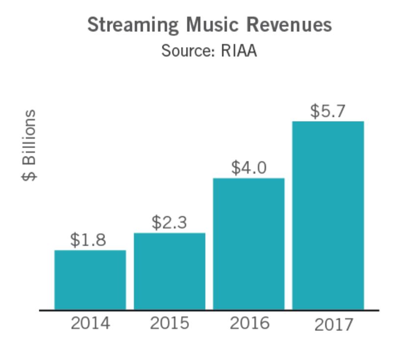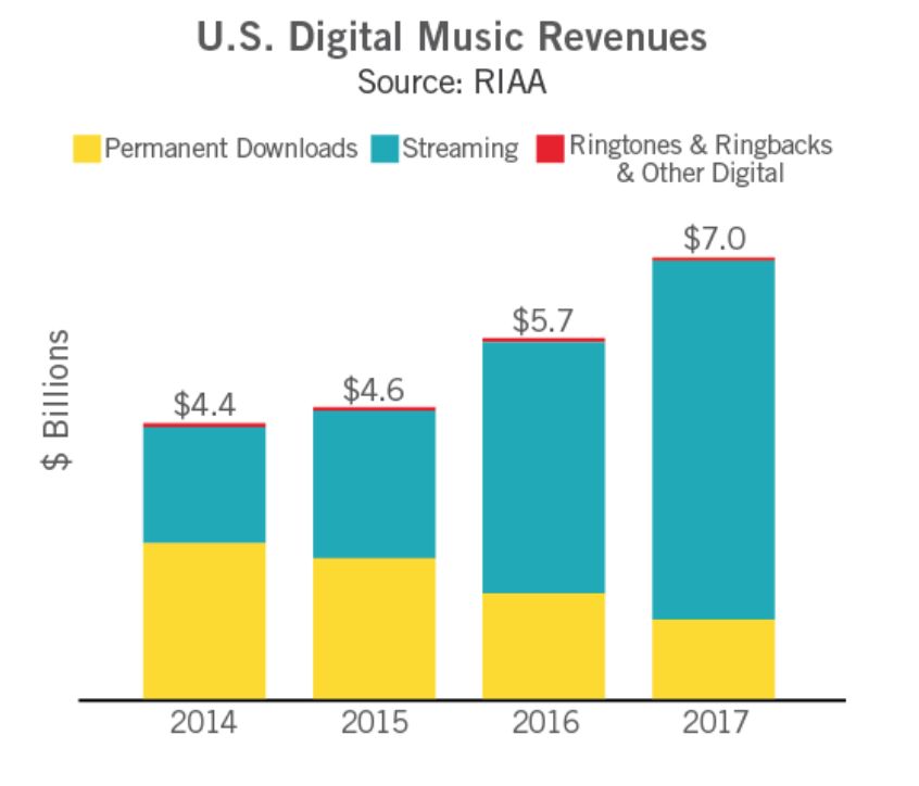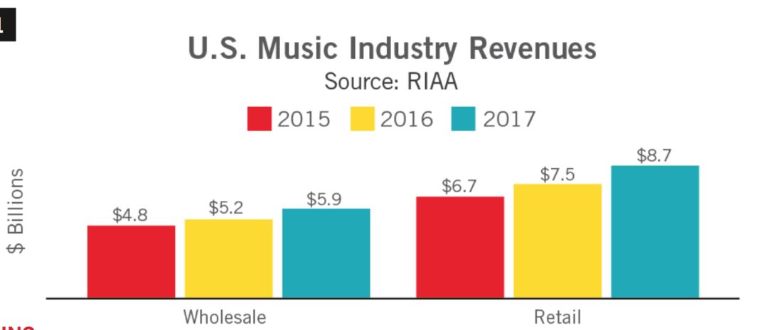 3月23日,美国唱片业协会(RIAA)发布了2017年全年美国唱片行业报告。整体来看,流媒体收入对全年收入的增长做出了巨大贡献,并且这也是自1999年以来,美国音乐产业整体收入连续两年出现实质性增长。