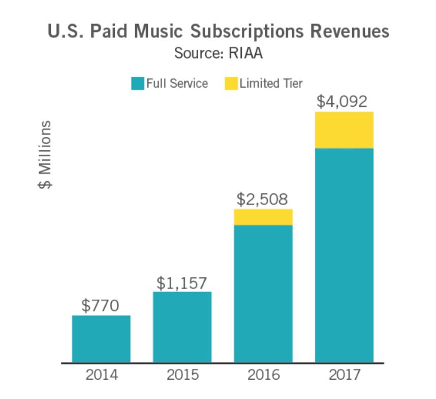 值得注意的是,在付费订阅流媒体中,像Apple Music、Amazon Unlimited以及Spotify Premium 这样的服务所贡献的收益年增长超过10亿美元,同比上涨了56%至35亿美元。而“有限服务的付费订阅”服务如Amazon的Echo及Prime、Spotify的非移动流媒体服务同比增长至了6亿美元。