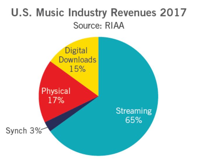 在总体收入中,流媒体收入贡献最多,占比达到65%,实体收入占比达到17%,数字下载收入占比达到15%。