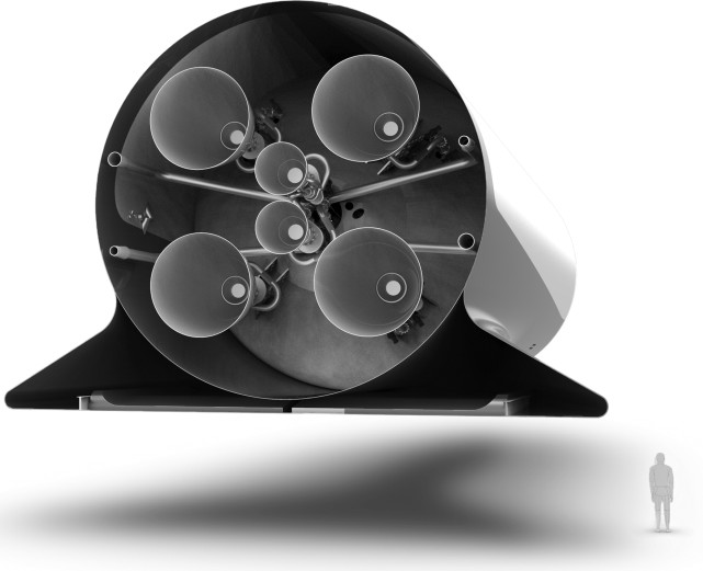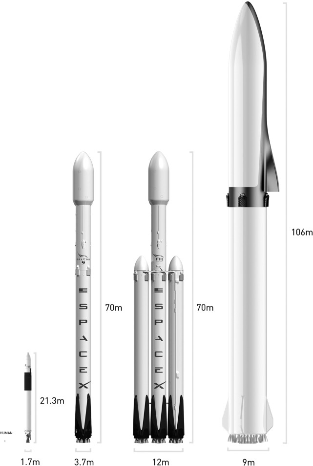 在BFR中,你可以通过观察下图中的人物对比来感受它的庞大。它真的是体积十分庞大的运载火箭,主体直径约9米,助推器由31个猛禽引擎提供升力,可产生约5400吨推力,将4400吨重的火箭直接举起。