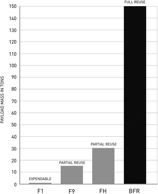 火箭负载能力,即将有效载荷送到近地轨道的能力。BFR具有比Saturn V更大的有效载荷能力,同时可以完全重复使用