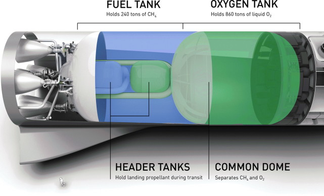飞船的主体也就是推进剂所在的位置,推进剂由冷却的甲烷和氧组成。当你把甲烷和氧气冷却到液化点下时,它们的密度会大幅增加,增幅可达10%到12%,这对推进剂的负载有很大影响。我们预计将携带240吨甲烷(CH4)和860吨氧气。当你着陆的时候,你的方向可能会发生很大的变化,但是你不能让推进剂在主油箱里到处晃动,你必须有能够精确地给主引擎供电的油枕,也就是你在图6中看到的浸泡在燃料箱中的东西。