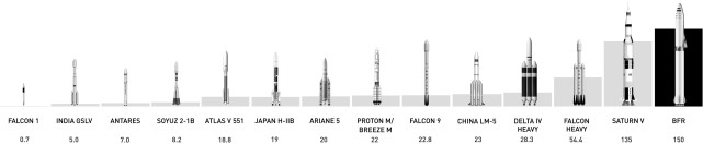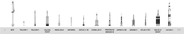 下图为我们展示了火箭的大致有效载荷能力,从最低载荷开始,猎鹰1号有效载荷为半吨,最终BFR可达到150吨。我认为很重要的一点是,BFR比Saturn V更强大,且可重复使用。但更重要的是,发射成本更低。