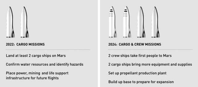 然后是2024年,我们想试着驾驶四艘飞船前往火星,包括两艘客运飞船和两艘货船。第一个任务目标是找到最好的水源,第二个任务目标是建造推进剂工厂。届时,我们在火星上将有6艘飞船,并有足够物资建立推进剂仓库,包括大型的太阳能电池板,然后进行采矿和提炼水,获得大气层中的二氧化碳,制造和存储深度低温的甲烷和氧气。