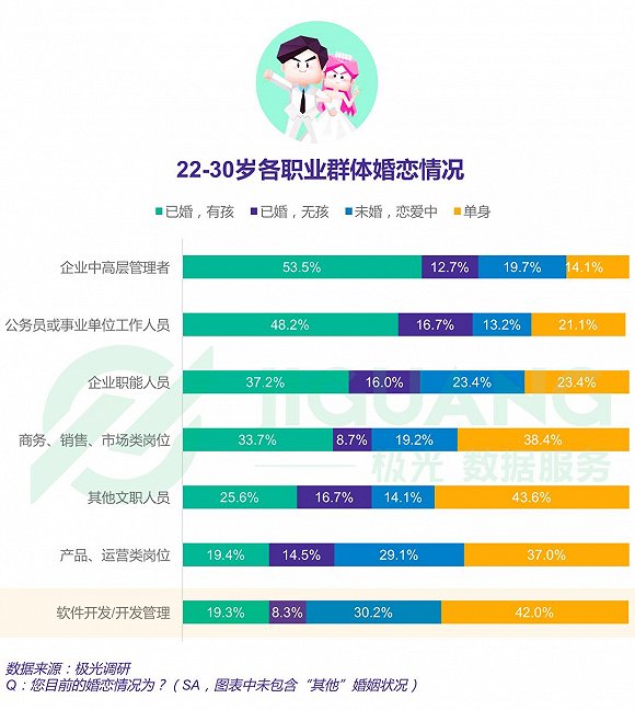 22-30岁的程序员中,19.3%已完成结婚生子的人生大事,在主要职业群体中比例最低42%的22-30岁受访程序员目前仍处于单身状态,世界这么大,适合他们的另一半大概是迷路了。
