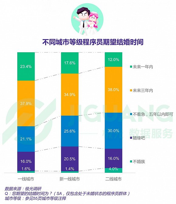 一线城市程序员,比较着急,23.4%期望未来一年内结婚二线城市程序员,不着急,30%认为五年之内都可以新一线城市程序员,佛系,20.5%认为随缘吧,都可以
