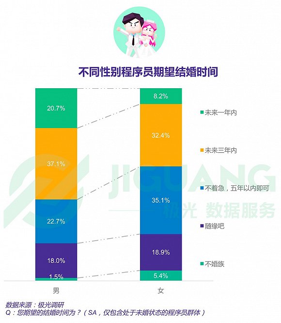 20.7%男性程序员期望未来一年内结婚,仅8.2%女性程序员持同样意见35.1%女性程序员则专注自我、无惧逼婚,认为五年以内结婚就好