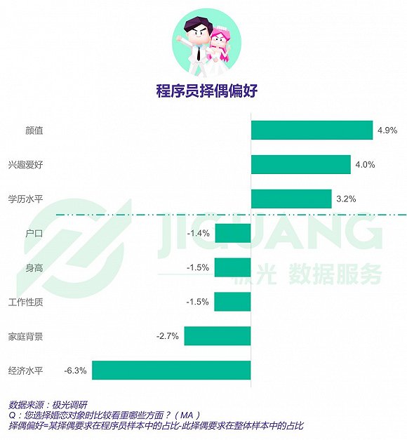 相比整体受访者,受访程序员更为关注颜值、兴趣爱好和学历水平,但不太在乎对方的经济水平、家庭背景、工作性质、身高和户口