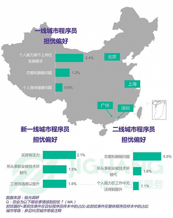 相比整体受访程序员,一线城市程序员更为担忧个人能力跟不上岗位发展要求,新一线最关注买房压力,二线城市程序员更为担心恋爱和婚姻问题