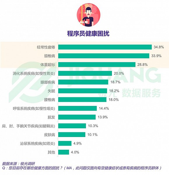 经常性疲倦、颈椎病、体重超标是困扰程序员群体的重要健康问题超过10%的受访程序员有失眠、脱发等问题