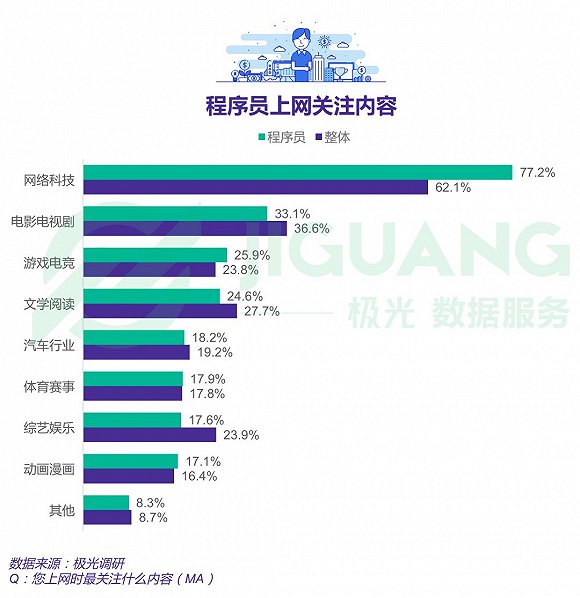 紧跟科技潮流,走在技术前端,77.2%的程序员上网关注网络科技内容相对整体受访者,受访程序员更为关注网络科技、游戏电竞等内容