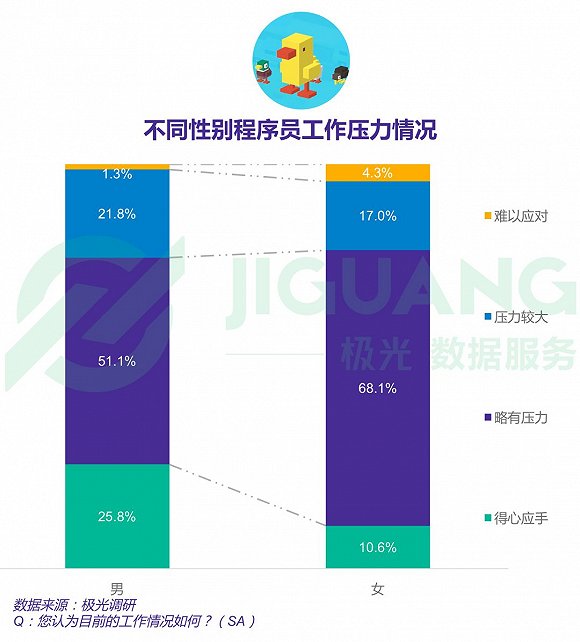 男性程序员面对工作更加从容有信心,25.8%的受访男性程序员认为对目前的工作得心应手,仅10.6%女性程序员这么认为21.8%的受访男性程序员认为目前的工作压力较大,17%的受访女性程序员持同样态度