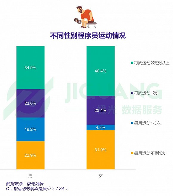 女性程序员中,40.4%每周运动2次以上,但也有31.9%每月运动不到1次男性程序员中,34.9%每周运动2次以上,23%每周运动1次